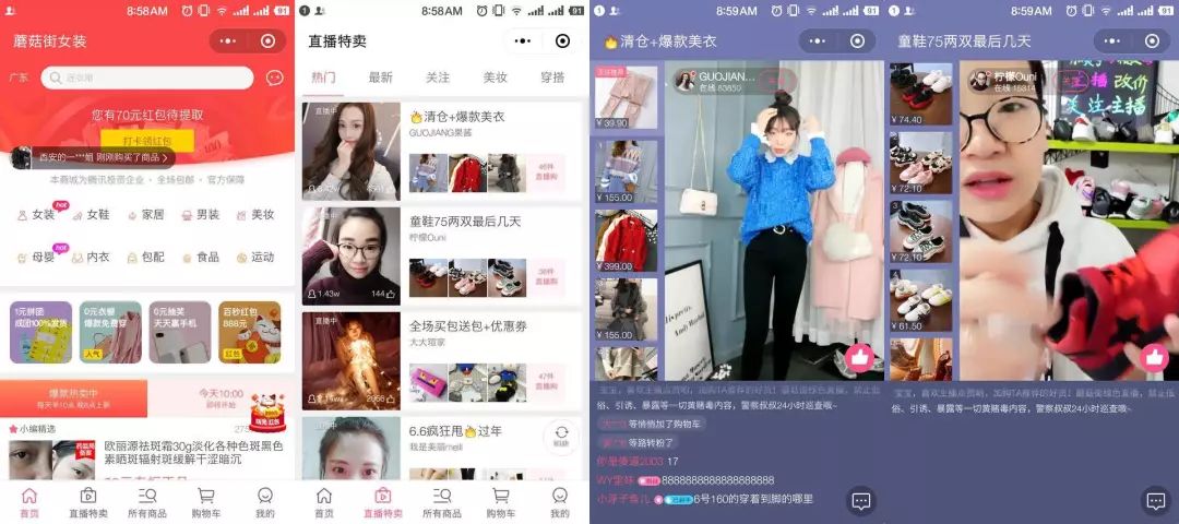 相对于程式单一的小程序而言,在早些日子,蘑菇街旗下的小程序“蘑菇街女装精选”上线了直播功能,以卖女装为主,与蘑菇街APP相比,小程序的直播操作更直观、简洁,用户可以在里面完成一系列的购物行为,无须从中跳转出来,前往另一个平台。