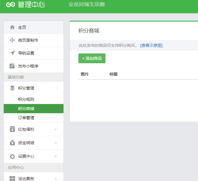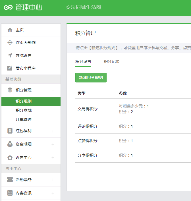 和现有商城、票务、内容资讯、同城生活、点餐、社群等应用深度打通,实现分享得积分,点赞得积分,评论得积分,交易得积分。商家管理后台如下图所示: