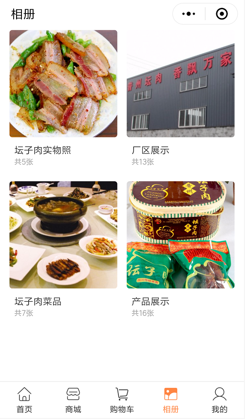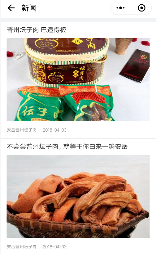 普州坛子肉是安岳的特产,风味独特,醇香可口,营养丰富。结合企业的需求,我们通过好建小程序haojian.cn提供的【微页面】【微商城】【相册】【内容管理】四个应用,为安岳县普州坛子肉公司制作的小程序,即可以实时发布公司新闻动态,全面展示企业形象、又可以实现产品的销售。?