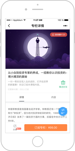 针对专栏的分享工具,邀请好友即可领取相应佣金,实现全民推广