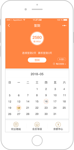 用户签到所得积分及余额可用于积分商城和会员升级等,线下礼品进店领取,也附带线下销售