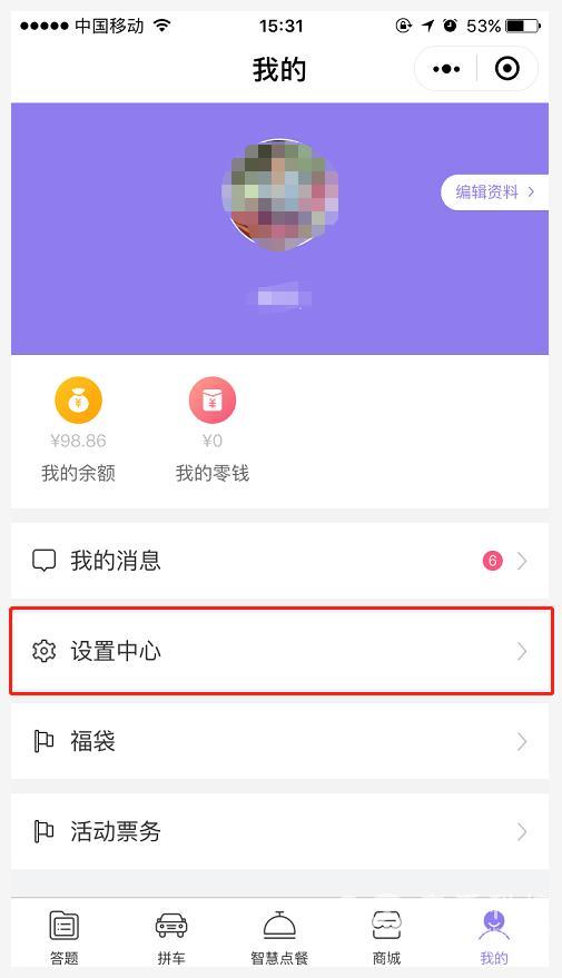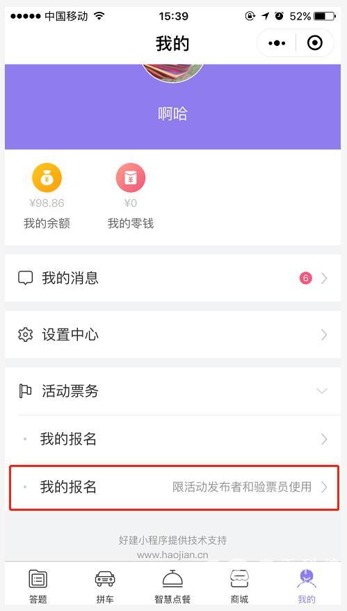 可以添加总验票员,也可以只针对单一活动添加验票员:1、首先被添加的验票员需在相应的小程序通过手机认证,进入小程序,选择底部导航,进入我的,点击设置中心。