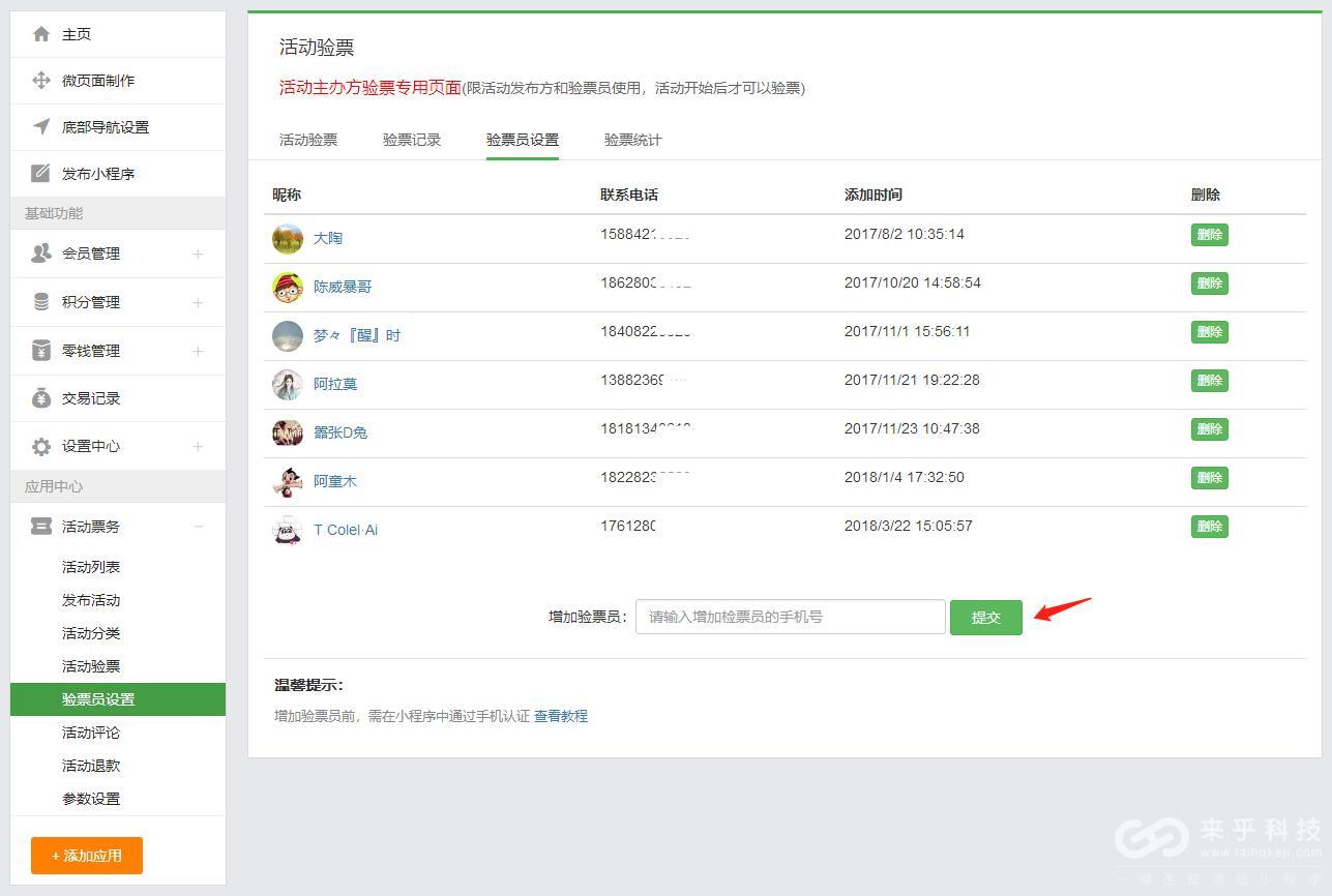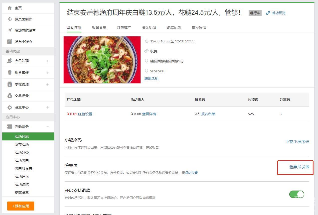 4、也可以在管理后台,进入某一个指定的活动,设置验票员